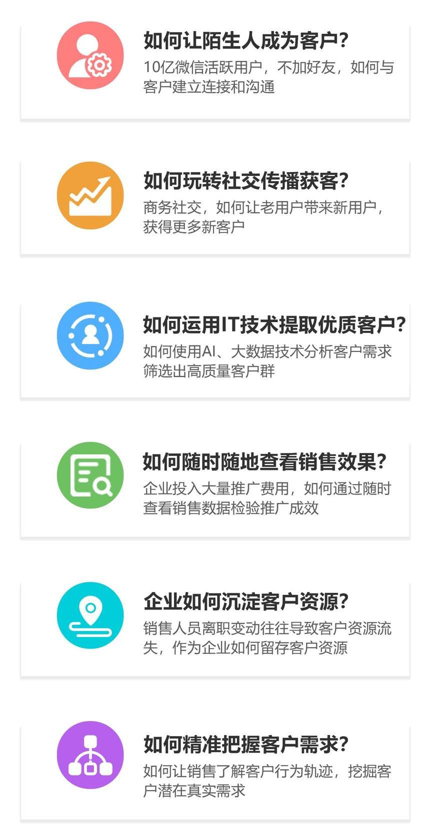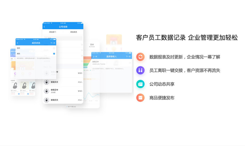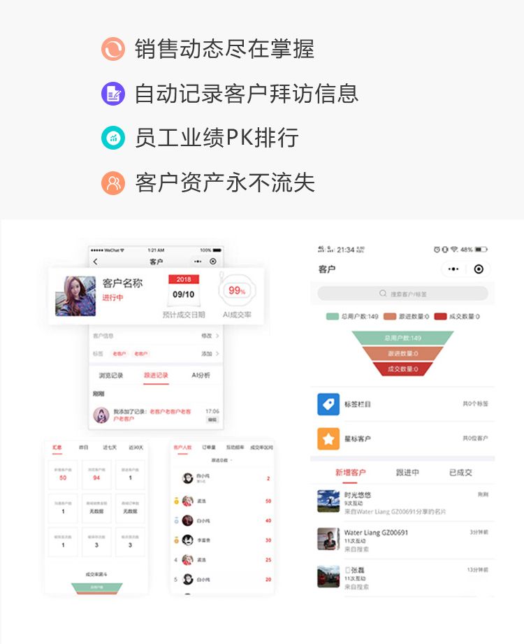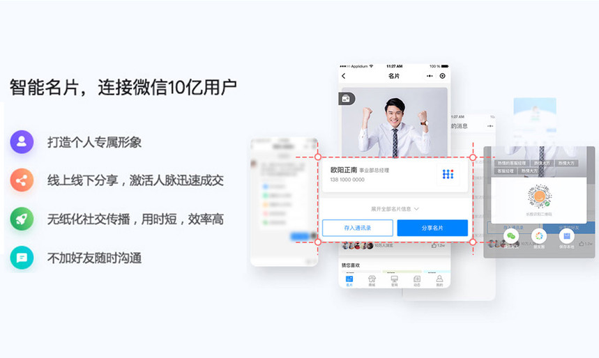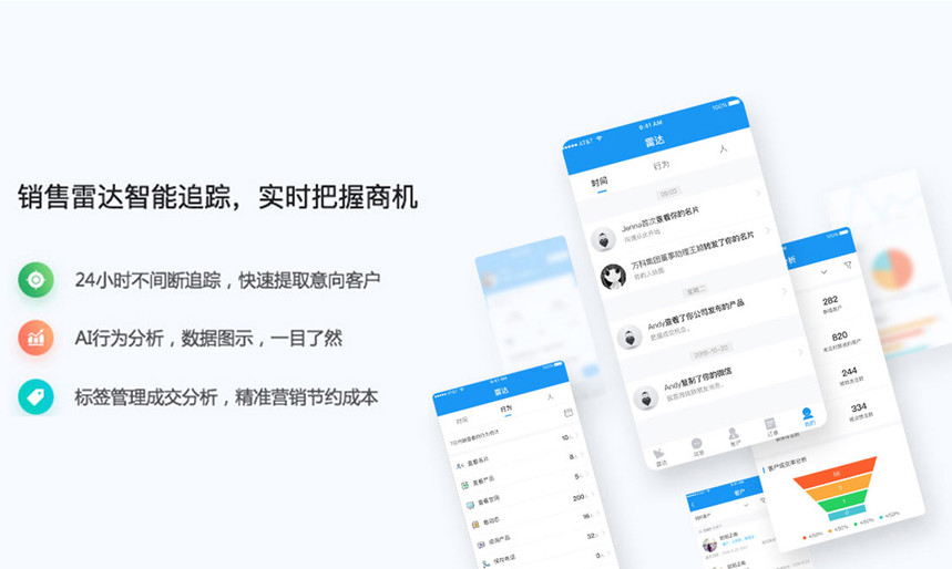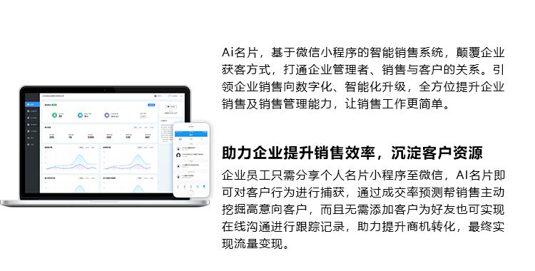 Ai名片,基于微信小程序的智能销售系统,颠覆企业获客方式,打通企业管理者,销售与客户的关系。引领企业销售向数字化,智能化升级,全方位提升企业销售及销售管理能力,让销售工作更简单。助力企业提升销售效率,沉淀客户资源:企业员工只需分享个人名片小程序至微信,AI名片即可对客户行为进行捕获,通过成交率预测帮销售主动挖掘高意向客户,而且无需添加客户为好友也可实现在线沟通进行跟踪记录,助力提升商机转化,最终实现流量变现。